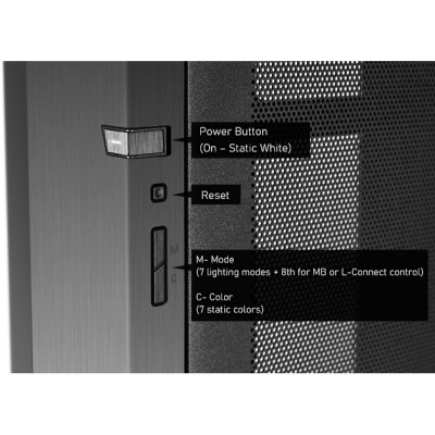 Ön panel LED şeridi, M düğmesiyle kontrol edilebilen 7 dahili aydınlatma efektine sahiptir. Anakart yazılım senkronizasyonunu veya L-Connect kontrolünü etkinleştirmek için 8. mod mevcuttur.